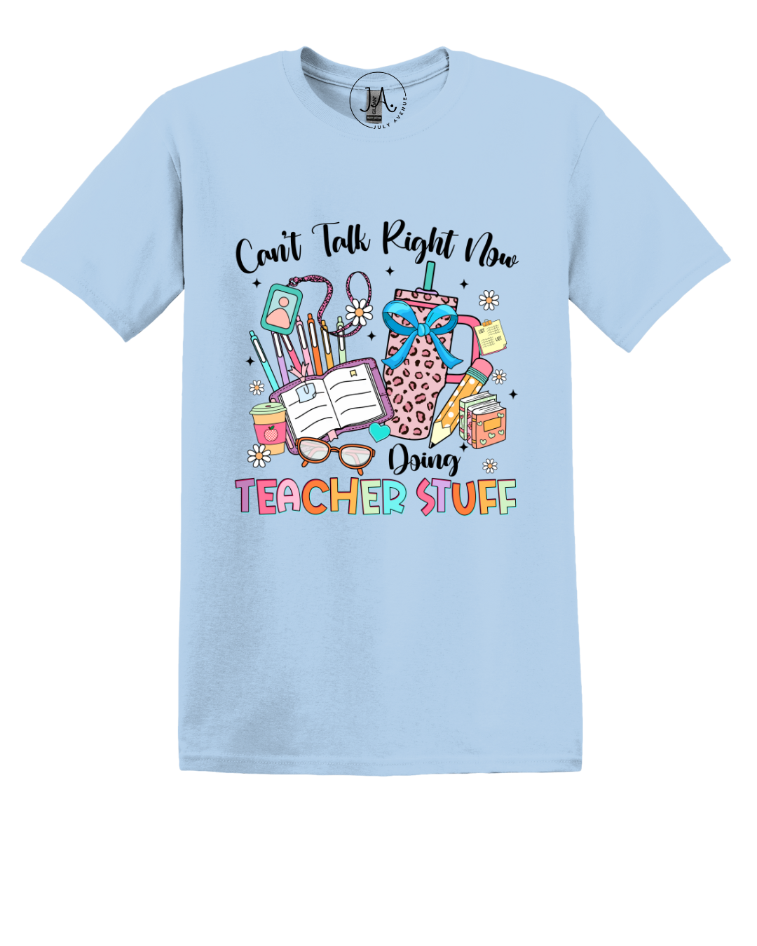 Keep it real (and a little witty) with our “Can’t Talk Right Now, Doing Teacher Stuff” graphic t-shirt in a refreshing light blue hue. This fun and relatable tee is perfect for busy educators who juggle lesson plans, coffee breaks, and classroom chaos with style.